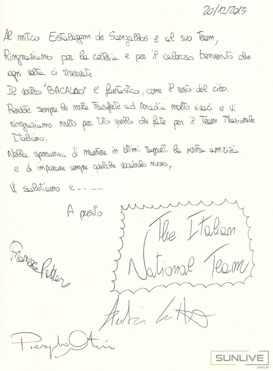"A seleção nacional de basquetebol masculino, sub-18, agradece a todos os funcionários e colaboradores da Estalagem de Sangalhos por toda a sua atenção e disponibilidade na criação de todas as condições para uma excelente e agradavel semana de trabalho."