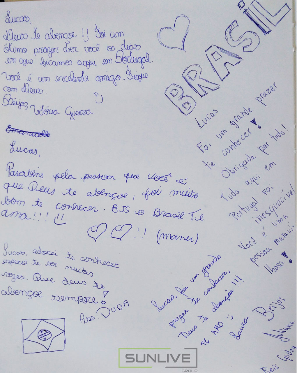 "Lucas, não há palavras para descrever o quanto bem nos sentimos cá. O tempo passou rápido mas o reencontro será em breve! Espero que tenhas gostado tanto desta "internacional team" como nós gostamos de tudo por cá."
